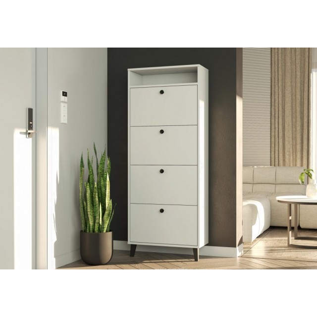 Batų spintelė HERMES Nr.04 yra erdvi ir funkcionali, su keturiais atverčiamais skyreliais, kurie patogiai talpina įvairaus dydžio batus. Tai puikus sprendimas tvarkingam ir estetiškam prieškambario interjerui.