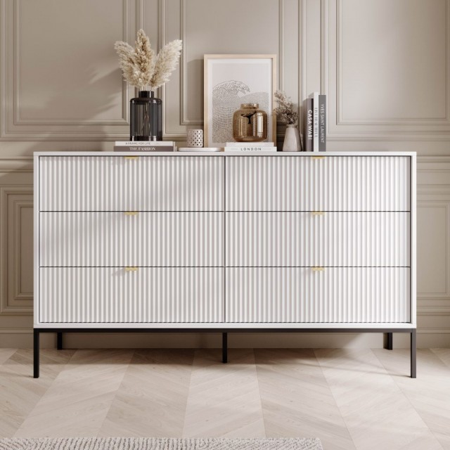 Įsimylėti iš pirmo žvilgsnio įmanoma! Frezuoti fasadų paviršiai, aukso spalvos rankenos ir metalinės kojos - akcentai, namuose sukursiantys darnią kompoziciją. "Nova" baldus lengvai priderinsite svetainės ar miegamojo kambariuose. Kolekcijoje rasite kelių dydžių komodas, konsolę-rašomąjį stalą, naktinius staliukus, žurnalinį staliuką. Baldų durų mechanizmas - užtikrinantis švelnų ir tylų uždarymą. Plokščių briaunos laminuotos ABS plastiku, apsaugančiu jas nuo neigiamo išorinio aplinkos poveikio. Džiaukitės kurdami išskirtinį, žavingą ir ryškų interjerą su "Nova"!